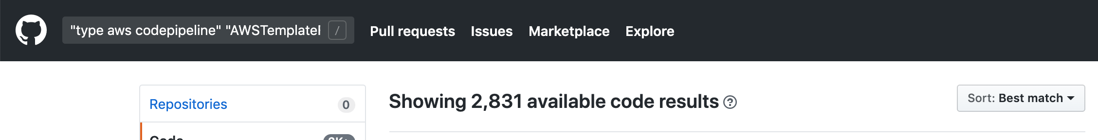 "type aws codepipeline"I deliberately haven't included the ":" as GitHub Search ignores them anyway. You'd think adding the full resource type (i.e. aws codepipeline pipeline) would work better, but GitHub doesn't seem to like it when your quoted string gets too long, and starts ignore the end.